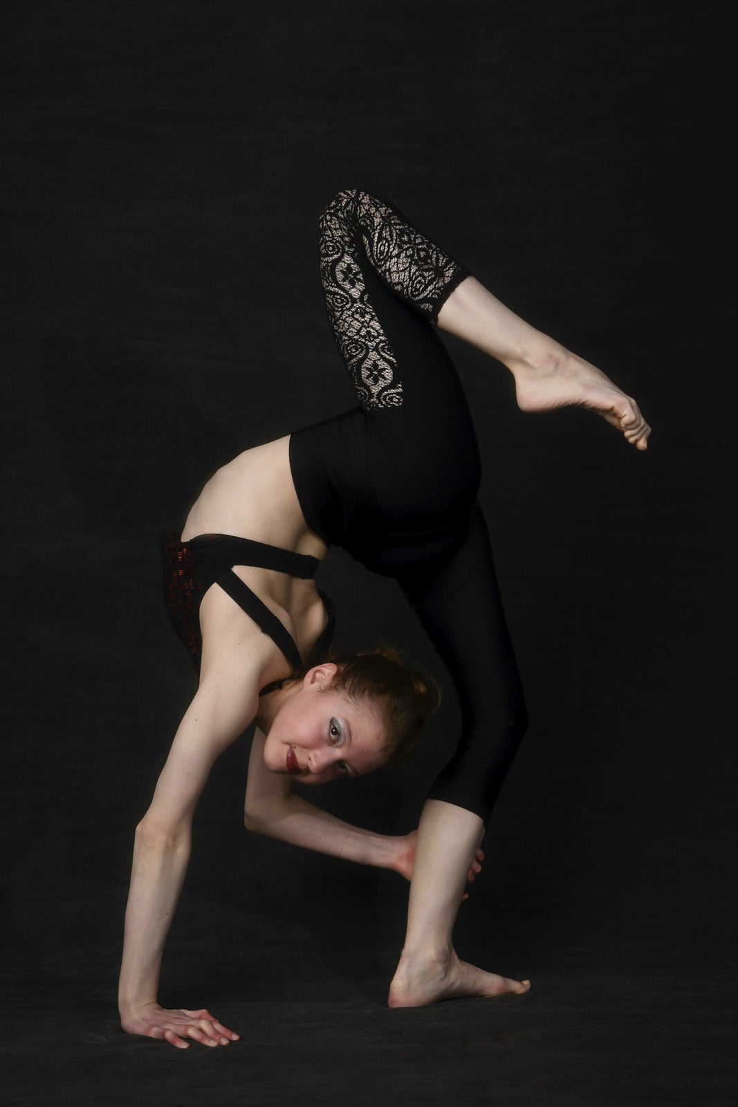There she is posing on the roof of a car with her heels over her head. That’s her standing on her hands while she lifts her legs into a perfectly perpendicular split. Now she’s molding her body into a bridge, stretching against the wall, and walking around her basement like an inverted crab.